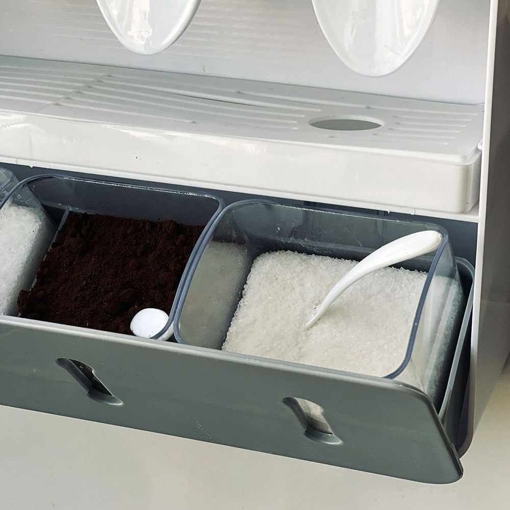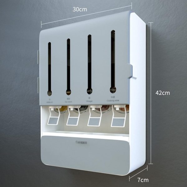 Fűszerek és fűszerek luxus függesztett szervezője – 4× tartály folyadékoknak és 4× ömlesztett fűszereknek, praktikus adagolókkal és kanalakkal (szürke ABS műanyag).