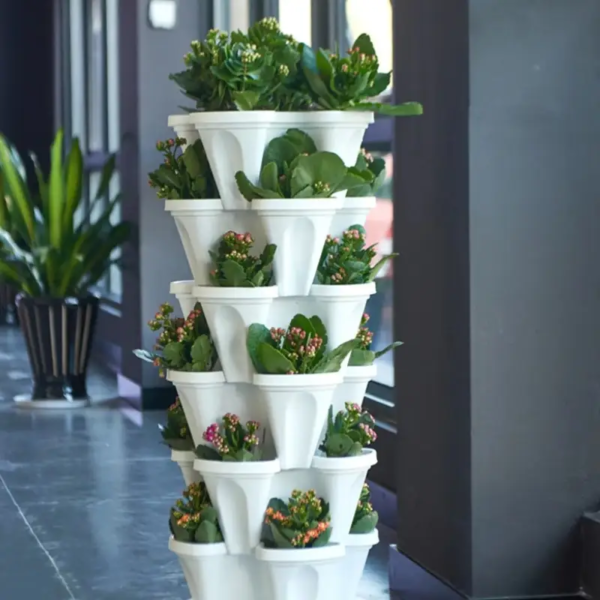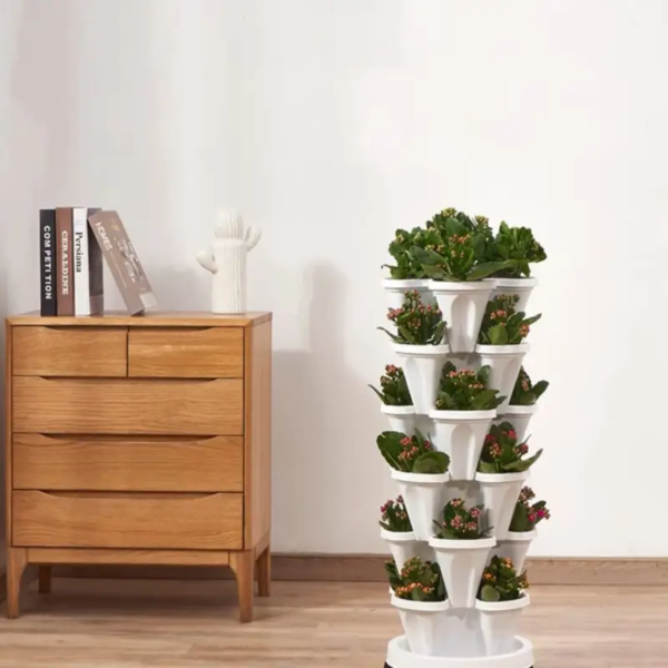 Az egymásra rakható cserepek nagyszerű kezdőcsomagként szolgálnak az ízletes eper, a buja virágok és az ízesítésre szolgáló aromás fűszernövények termesztéséhez.