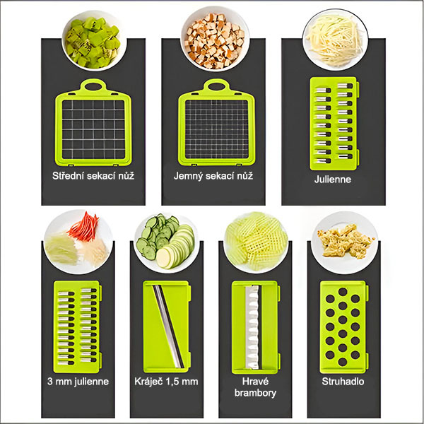 Válasszon a különböző tartozékok közül, hogy a zöldségeket különböző formákra és méretekre vághassa, az Ön preferenciáinak megfelelően.